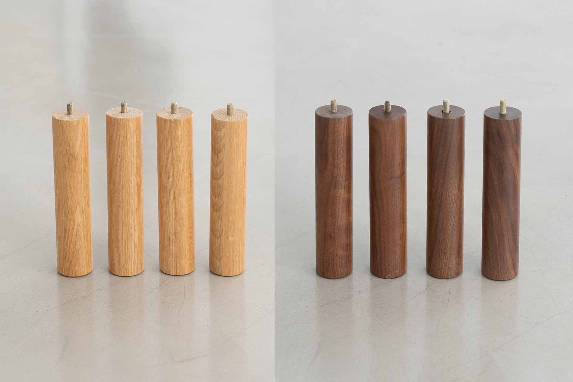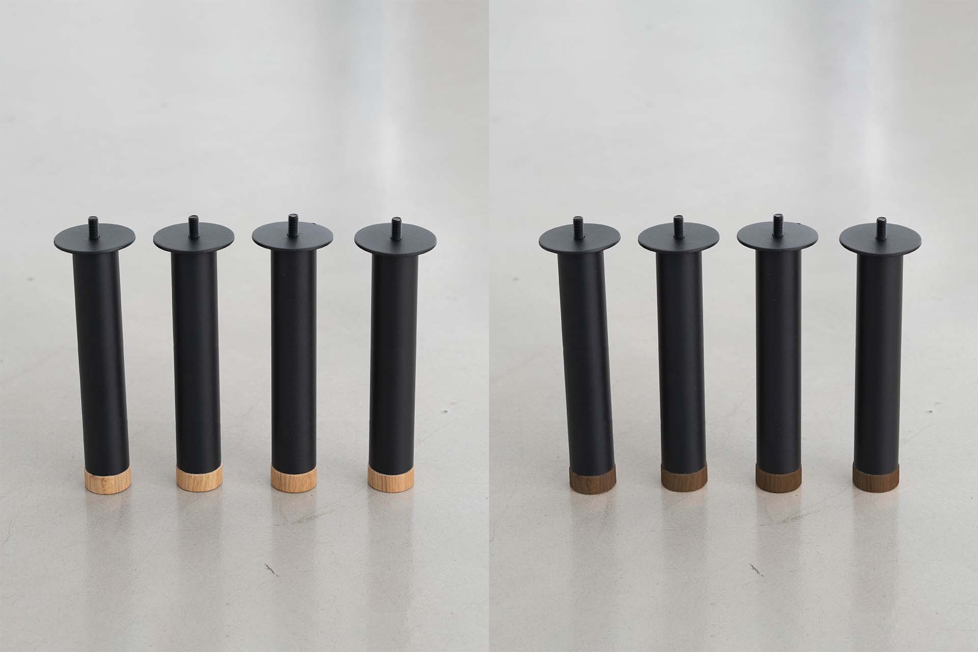 スッと伸びた細身のスチール脚は、脚先の無垢がアクセント。