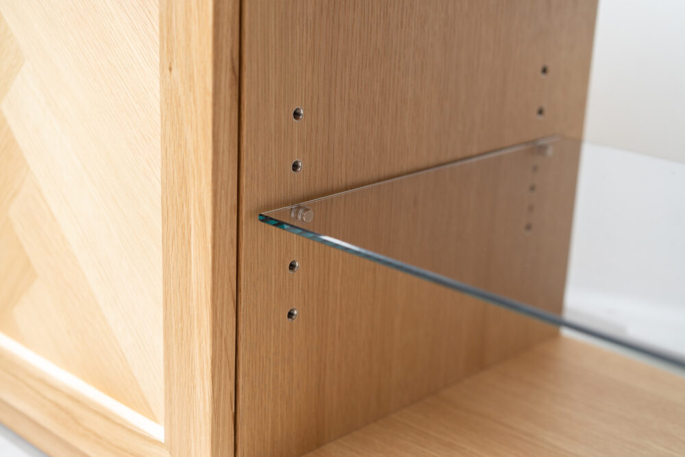 ヘリンボーン柄に貼り合わせたランダムな木目が単調になりがちな木製の収納家具に深みをあたえてくれます。