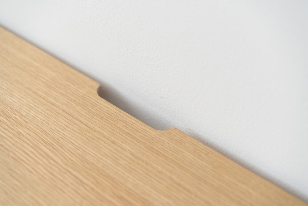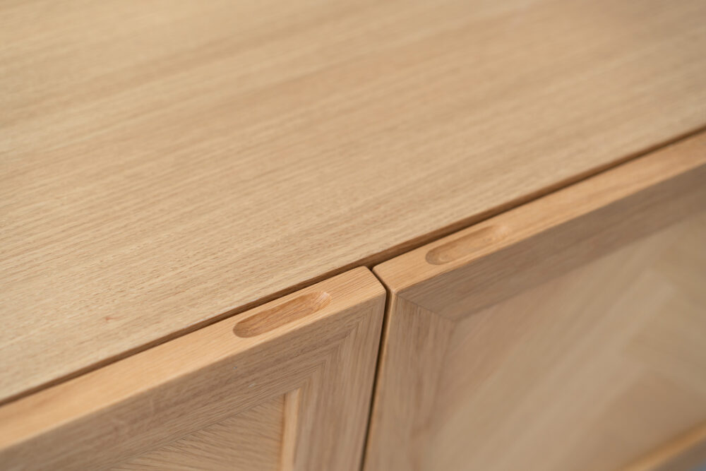 ヘリンボーン柄に貼り合わせたランダムな木目が単調になりがちな木製の収納家具に深みをあたえてくれます。